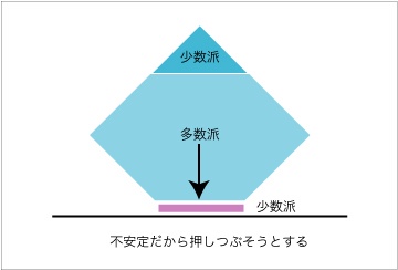 安定させようとして下部の少数派を押しつぶそうとすることがある。あるいは「ないもの」として排除する場合もあるかもしれない。ただし、仮に排除されたとしても、下部の少数派は上部の多数派から必ず新たに生まれてくる。
