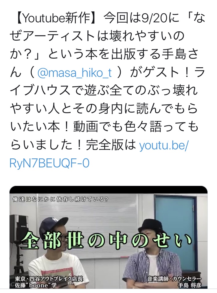 いっぱいいろんなことを話したんですが、最後の質疑応答で「結局、世の中が全部悪いと思うんですよ」という質問を頂きました。そう、まさにそれなんです。「全部世の中が悪い」。こういう言い方をするといろいろと誤解を生じるかもしれないというのは承知の上で、これはこの本を書くにあたっても一貫した僕のスタンスです。それが伝わったというのはとても嬉しい。ライブハウス四谷アウトブレイクの店長の佐藤さんのYoutubeチャンネルにお邪魔してそのあたりのことも話していますので、こちらもご覧下さい。