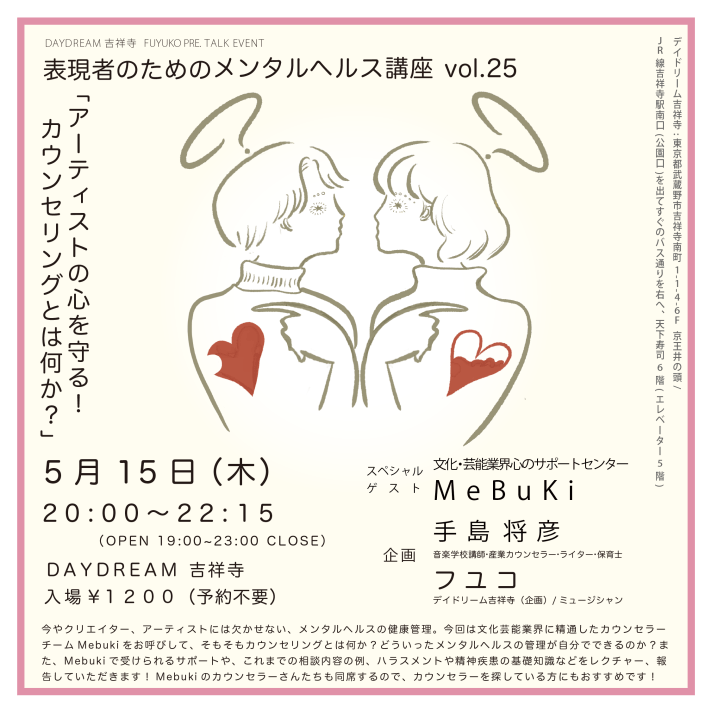 まず、2025年5月15日(木)に、いつも自分が出ています「表現者のためのメンタルヘルス講座」でMeBuKiの代表である小野寺史穂理さんが出演されて「アーティストの心を守る!カウンセリングとは何か?」が開催されます。詳細は下記のフライヤーをご覧ください。